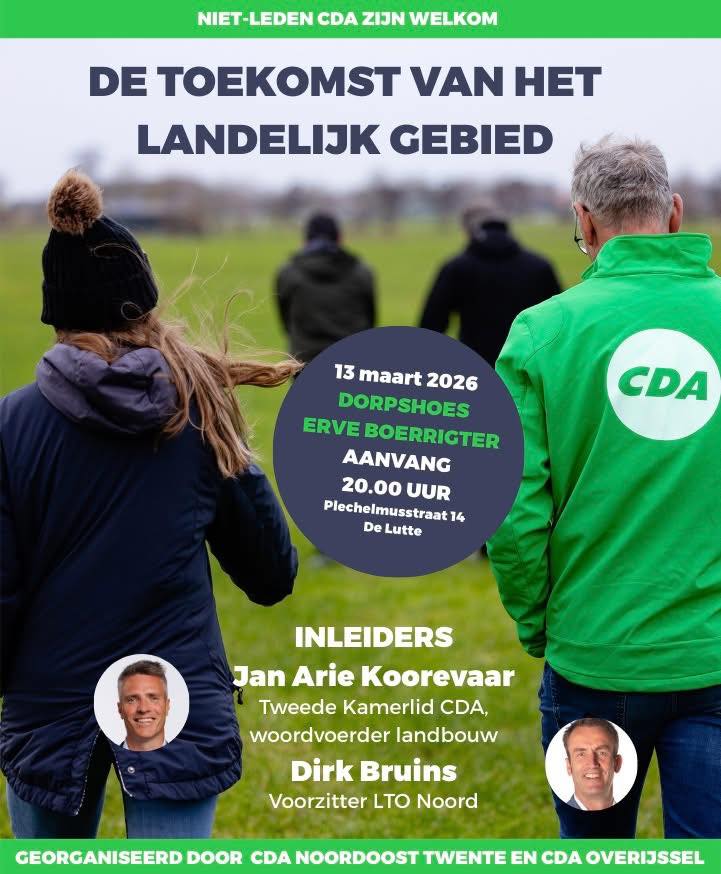 CDA Overijssel en het CDA in Noordoost‑Twente (Tubbergen, Losser, Oldenzaal en Dinkelland) organiseren op 13 maart in De Lutte een bijeenkomst over de toekomst van het landelijk gebied. Met bijdragen van Jan Arie Koorevaar (Tweede Kamerlid, woordvoerder landbouw) en Dirk…